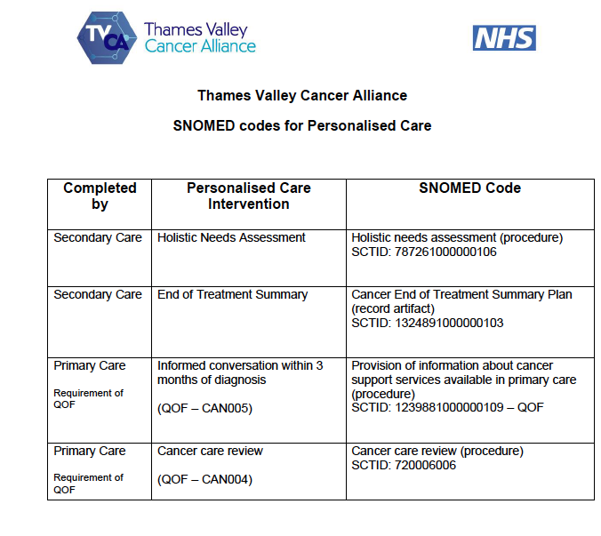- a treatment summary completed at the end of every phase of acute treatment, sent to the patient and their GP – which provides information about side effects and/or consequences of treatment, signs and symptoms of a recurrence and READ codes for the diagnosis and treatment so that the GP can update their patient database.