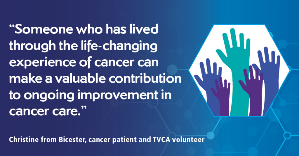 So if you have been touched by cancer and want to put your experience to good use within our NHS, email Lisa Cox, the TVCA Patient Engagement and Experience Lead, for an informal chat about how you could come on board.
